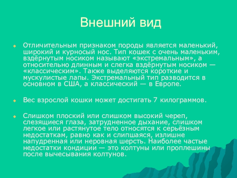 кошек с очень маленьким, вздёрнутым носиком называют «экстремальным», а относительно длинным и слегка вздёрнутым носиком — «классическим». Также выделяются короткие и мускулистые лапы. Экстремальный тип разводится в основном в США, а классический — в Европе.