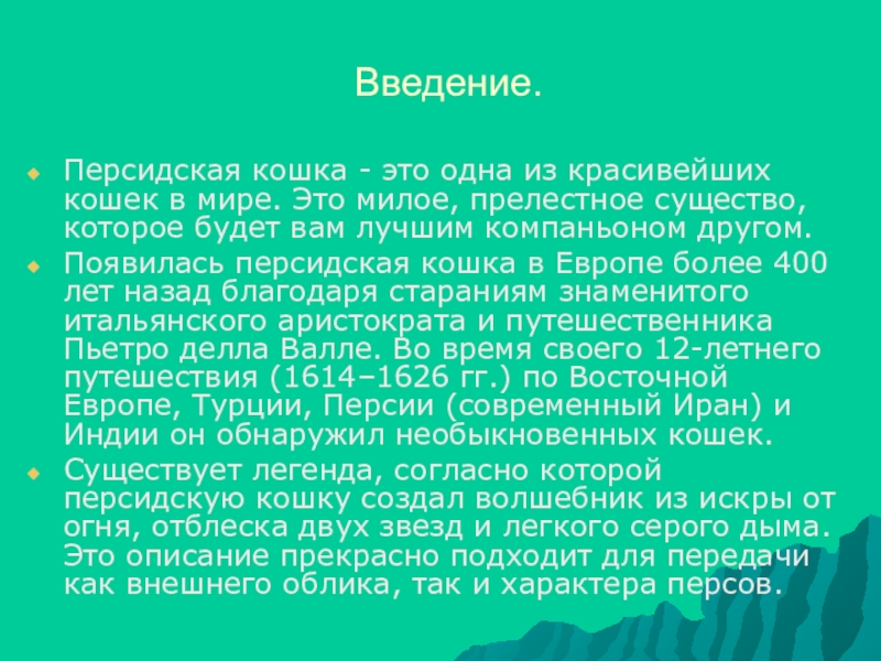 Появилась персидская кошка в Европе более 400 лет назад благодаря стараниям знаменитого итальянского аристократа и путешественника Пьетро делла Валле. Во время своего 12-летнего путешествия (1614–1626 гг.) по Восточной Европе, Турции, Персии (современный Иран) и Индии он обнаружил необыкновенных кошек.