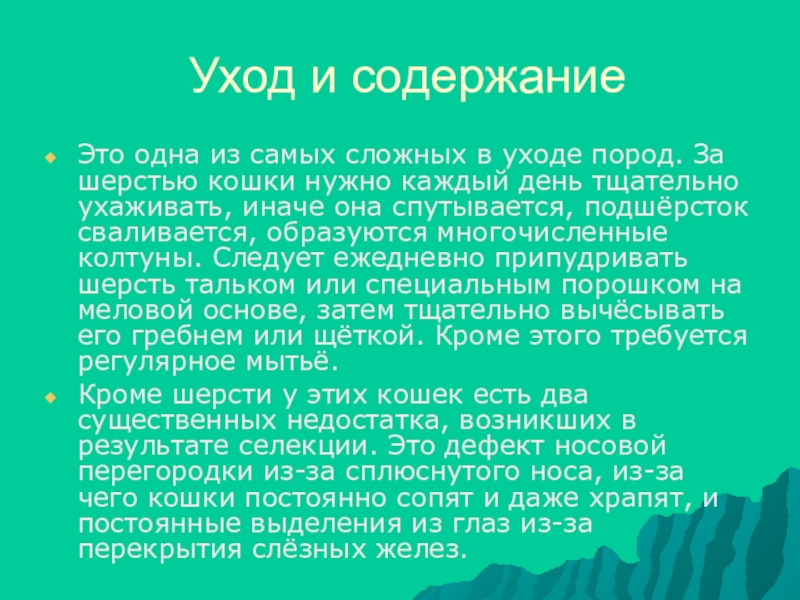 шерстью кошки нужно каждый день тщательно ухаживать, иначе она спутывается, подшёрсток сваливается, образуются многочисленные колтуны. Следует ежедневно припудривать шерсть тальком или специальным порошком на меловой основе, затем тщательно вычёсывать его гребнем или щёткой. Кроме этого требуется регулярное мытьё.