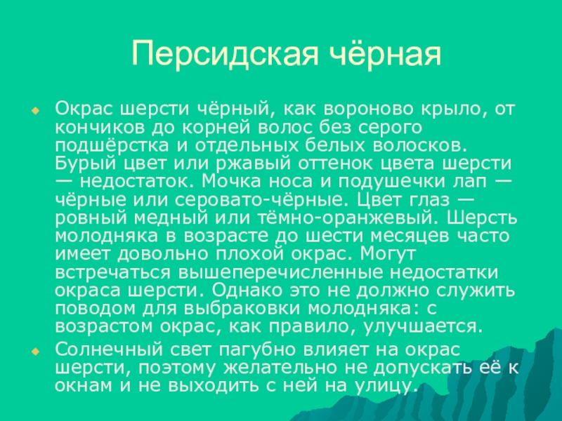Окрас шерсти чёрный, как вороново крыло, от кончиков до корней