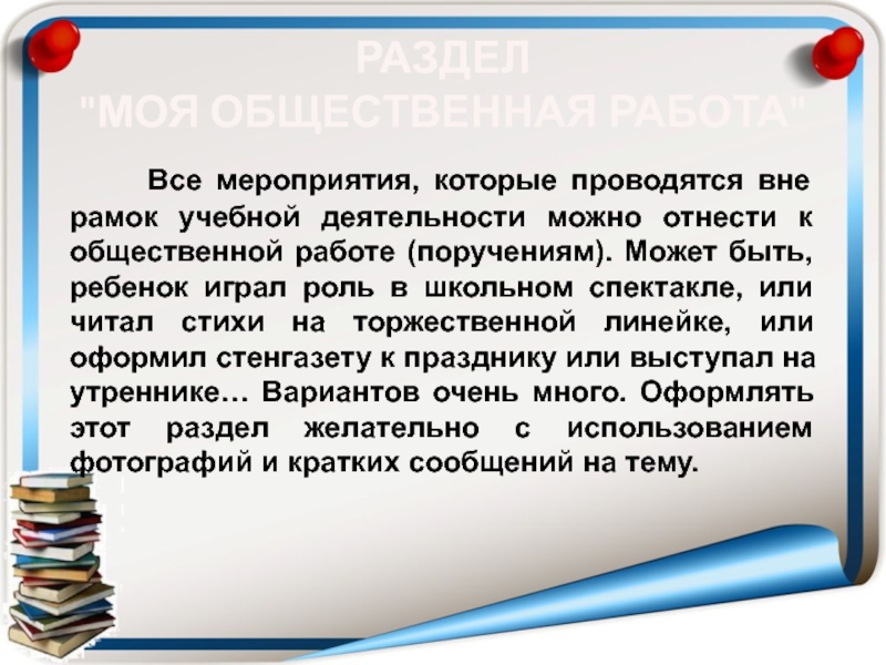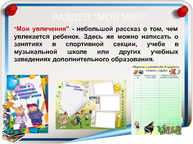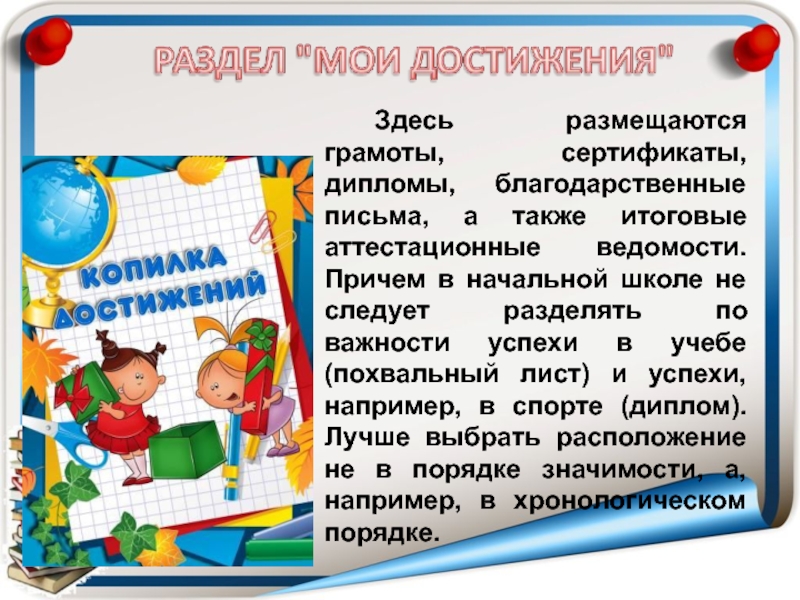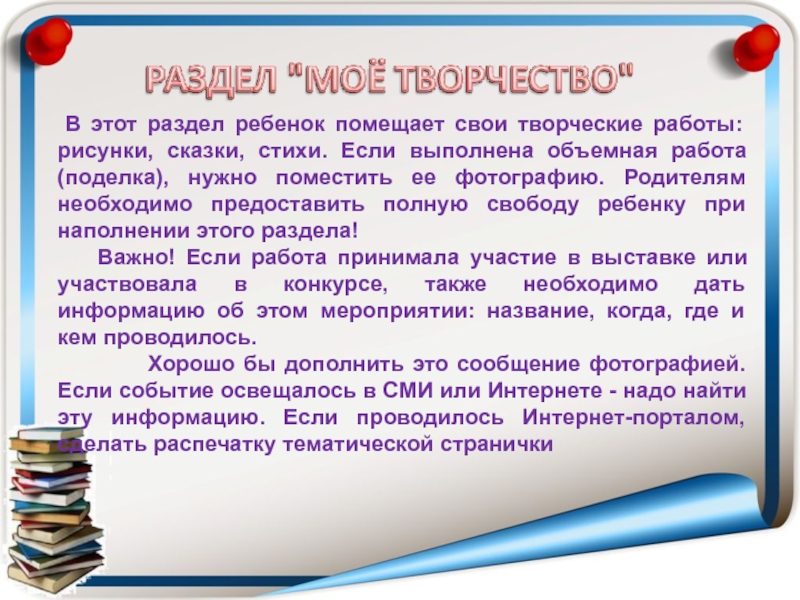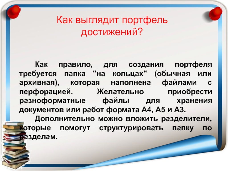 папка "на кольцах" (обычная или архивная), которая наполнена файлами с перфорацией. Желательно приобрести разноформатные файлы для хранения документов или работ формата А4, А5 и А3.