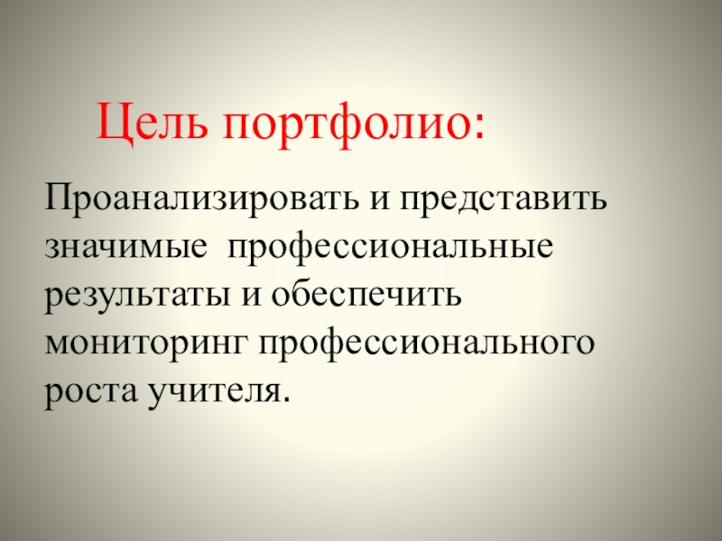 Цель портфолио:Проанализировать и представить значимые профессиональные результаты и обеспечить мониторинг профессионального роста учителя.