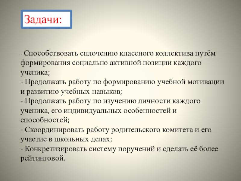 Задачи:- Способствовать сплочению классного коллектива путём формирования социально активной позиции каждого ученика;- Продолжать работу по формированию учебной