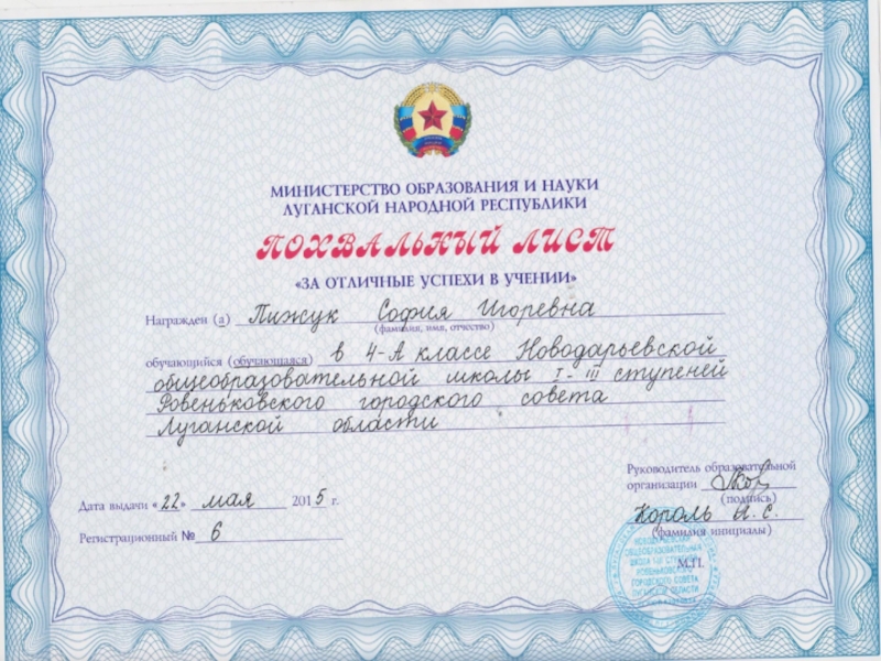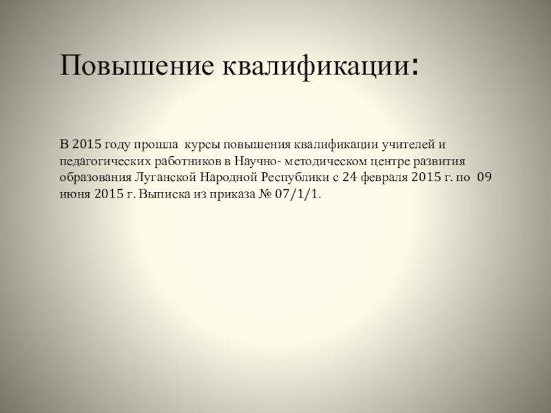 работников в Научно- методическом центре развития образования Луганской Народной Республики с 24 февраля 2015 г. по 09 июня 2015 г. Выписка из приказа № 07/1/1.