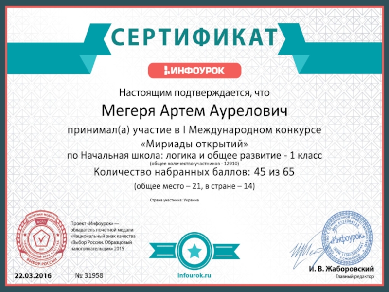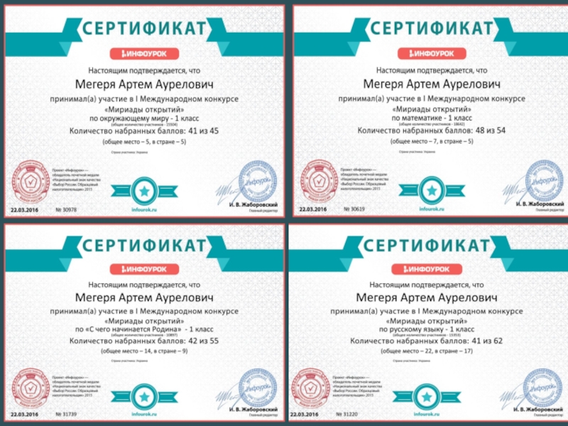 Слайд 14Мегеря Артем – участник Международных олимпиад и городских конкурсов.