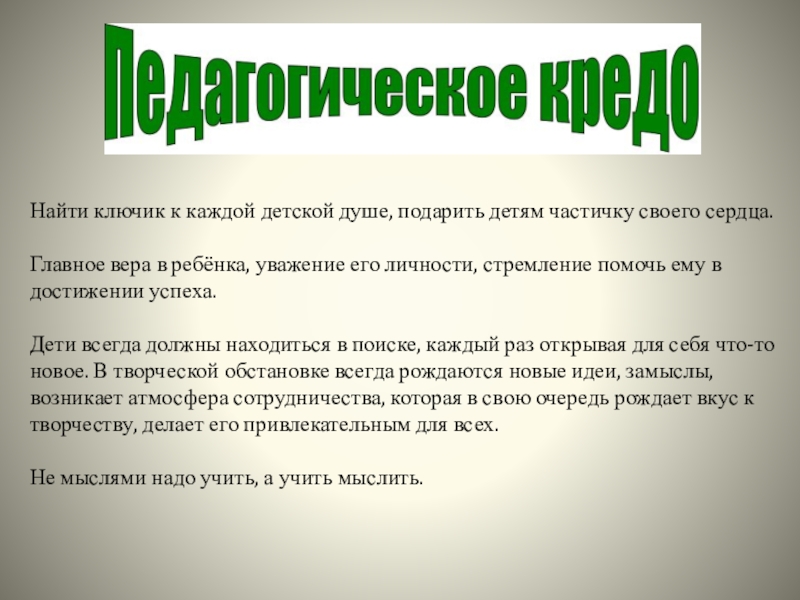 Найти ключик к каждой детской душе, подарить детям частичку своего сердца.Главное вера в ребёнка, уважение его личности,
