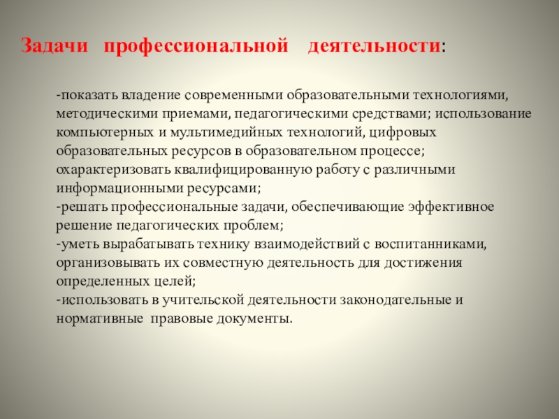Задачи  профессиональной  деятельности:-показать владение современными образовательными технологиями, методическими приемами, педагогическими средствами; использование компьютерных и мультимедийных