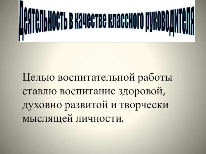Слайд 26Целью воспитательной работы ставлю воспитание здоровой, духовно развитой и творчески мыслящей
