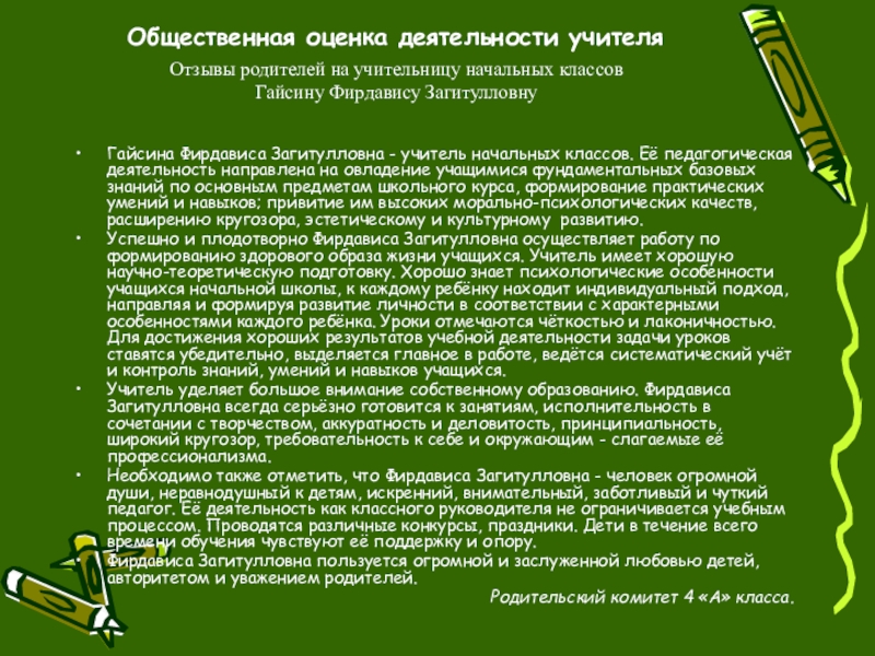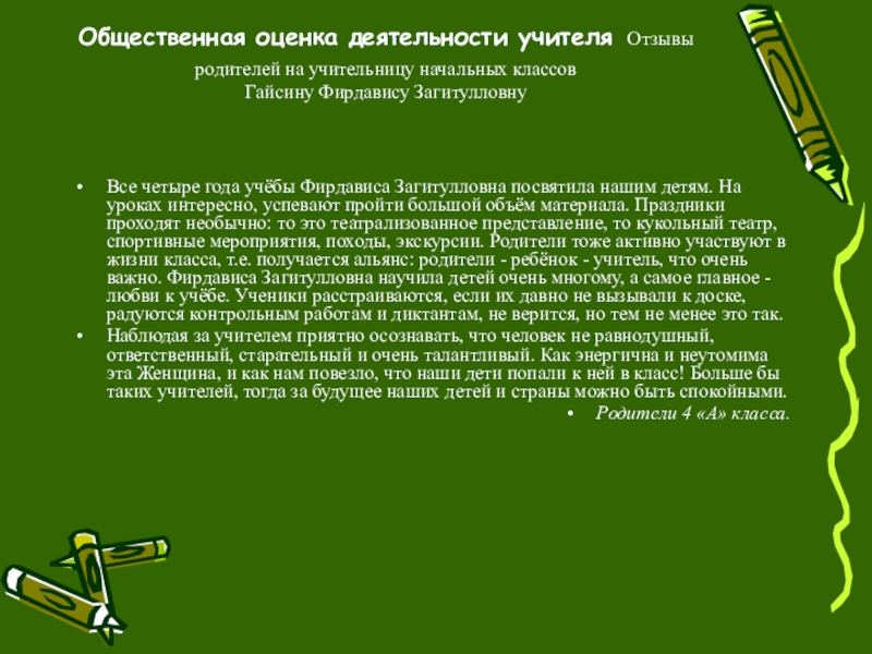 Все четыре года учёбы Фирдависа Загитулловна посвятила нашим детям. На уроках интересно, успевают пройти большой объём материала. Праздники проходят необычно: то это театрализованное представление, то кукольный театр, спортивные мероприятия, походы, экскурсии. Родители тоже активно участвуют в жизни класса, т.е. получается альянс: родители - ребёнок - учитель, что очень важно. Фирдависа Загитулловна научила детей очень многому, а самое главное - любви к учёбе. Ученики расстраиваются, если их давно не вызывали к доске, радуются контрольным работам и диктантам, не верится, но тем не менее это так.
