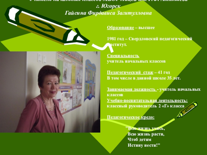 Гайсина Фирдависа Загитулловна - учитель начальных классов. Её педагогическая деятельность направлена на овладение учащимися фундаментальных базовых знаний по основным предметам школьного курса, формирование практических умений и навыков; привитие им высоких морально-психологических качеств, расширению кругозора, эстетическому и культурному развитию.