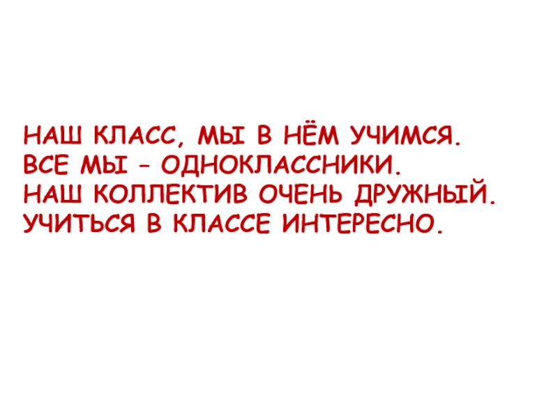 НАШ КЛАСС, МЫ В НЁМ УЧИМСЯ.ВСЕ МЫ – ОДНОКЛАССНИКИ.НАШ КОЛЛЕКТИВ ОЧЕНЬ ДРУЖНЫЙ.УЧИТЬСЯ В КЛАССЕ ИНТЕРЕСНО.