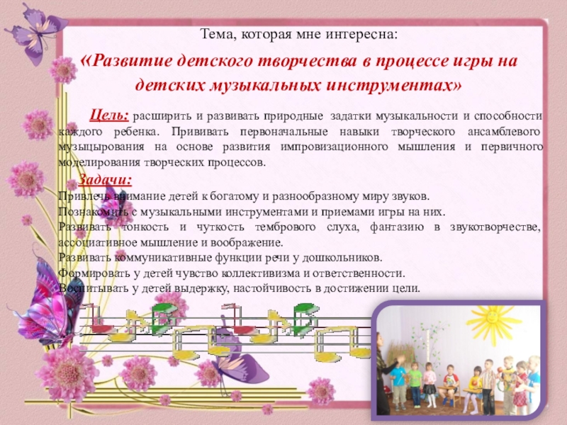 Цель: расширить и развивать природные задатки музыкальности и способности каждого ребенка. Прививать первоначальные навыки творческого ансамблевого музыцырования на основе развития импровизационного мышления и первичного моделирования творческих процессов.