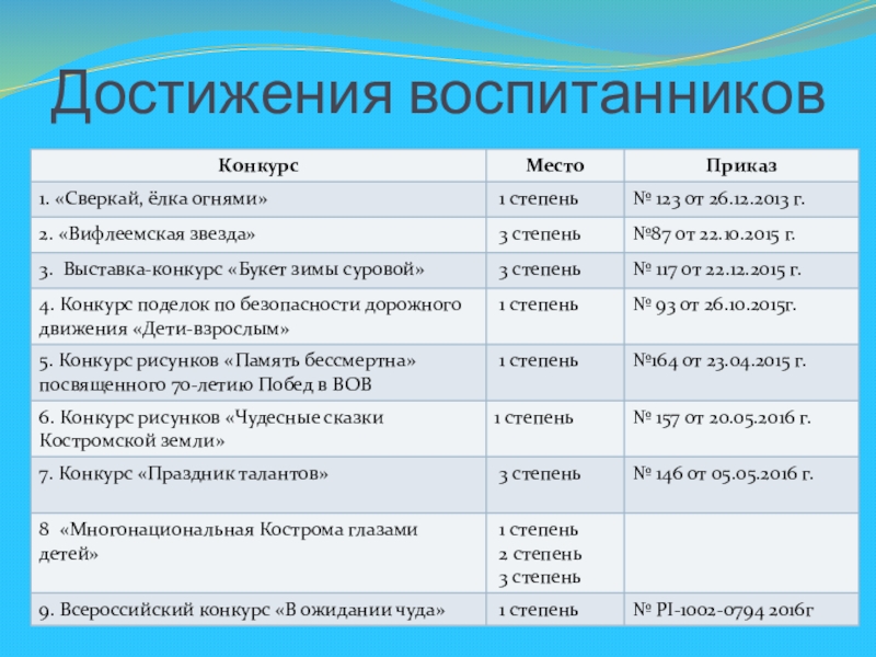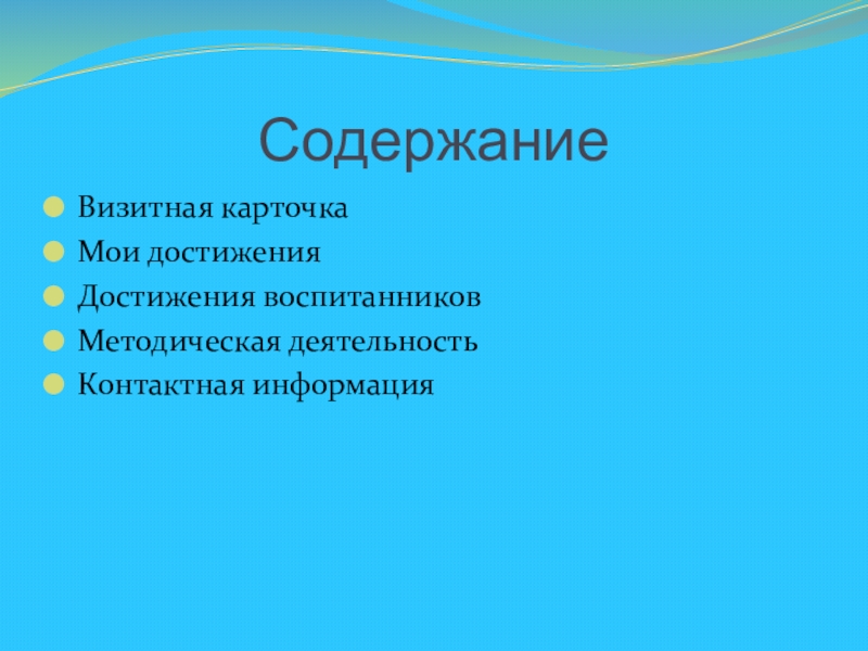 СодержаниеВизитная карточкаМои достиженияДостижения воспитанниковМетодическая деятельностьКонтактная информация
