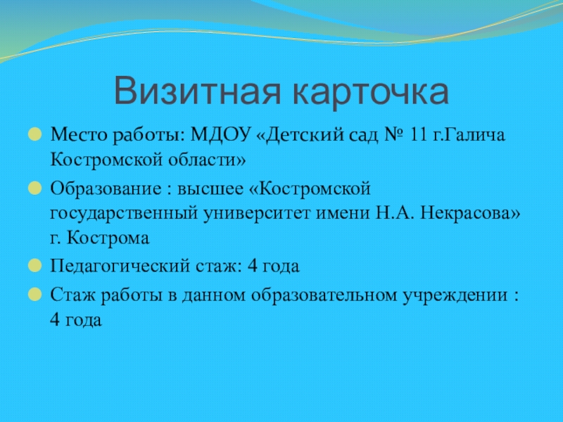 Визитная карточкаМесто работы: МДОУ «Детский сад № 11 г.Галича Костромской области»Образование : высшее «Костромской государственный университет имени