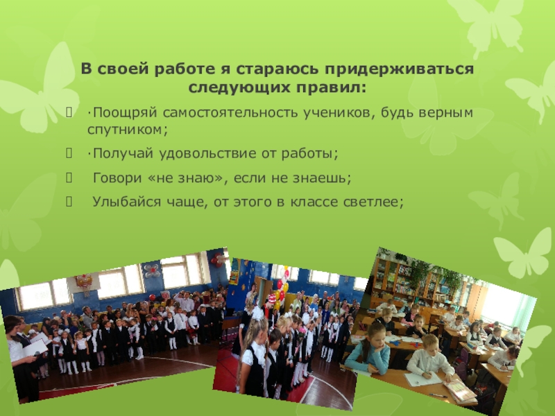 Что же касается того, хочу ли я найти свое продолжение в своих учениках? Конечно, да! Но чтобы учить и воспитывать других, надо постоянно учиться и совершенствоваться самой, ибо ничего не стоит на месте, все течет и изменяется, как изменяется сама жизнь. И если я вложу частичку себя, своей души, своего сердца в каждого своего ученика и увижу, что мои ученики стали просто хорошими людьми, успешными в жизни, я пойму: мое дело не пропало даром, и я не зря живу!