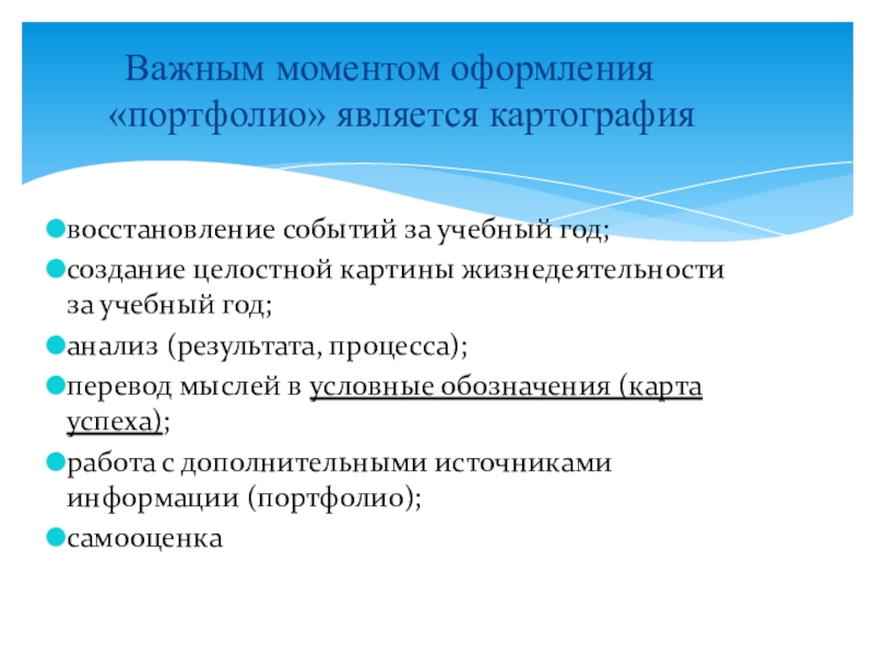 Важным моментом оформления  «портфолио» является картография восстановление событий за учебный год;создание целостной картины жизнедеятельности за учебный