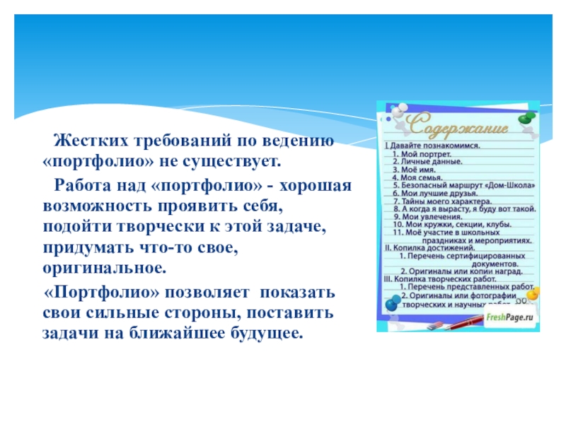 Жестких требований по ведению «портфолио» не существует. 	Работа над «портфолио» - хорошая возможность проявить себя, подойти творчески
