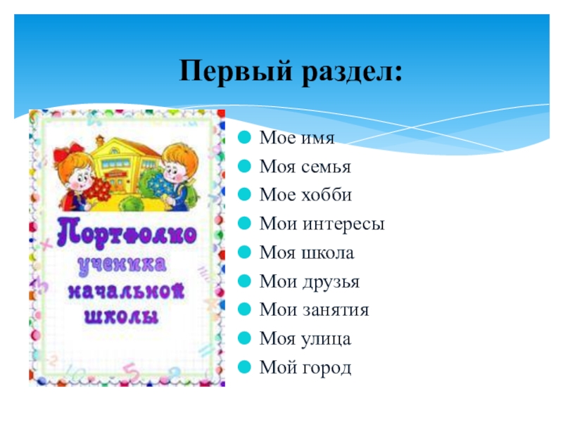Первый раздел:Мое имяМоя семьяМое хоббиМои интересыМоя школаМои друзьяМои занятияМоя улицаМой город