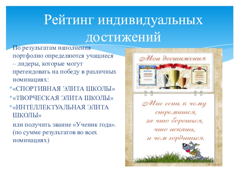 Рейтинг индивидуальных достиженийПо результатам наполнения портфолио определяются учащиеся – лидеры, которые могут претендовать на победу в различных