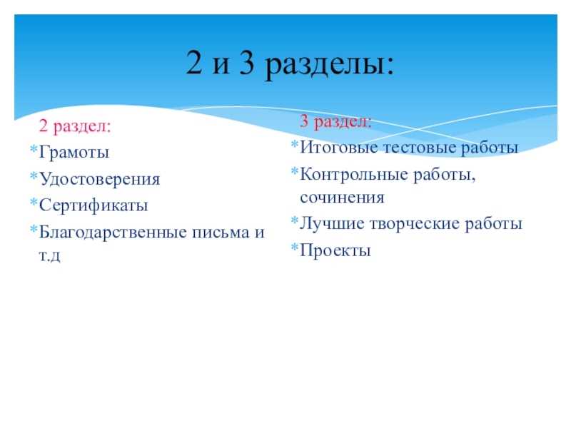 2 и 3 разделы:2 раздел:ГрамотыУдостоверенияСертификатыБлагодарственные письма и т.д3 раздел:Итоговые тестовые работыКонтрольные работы, сочиненияЛучшие творческие работыПроекты