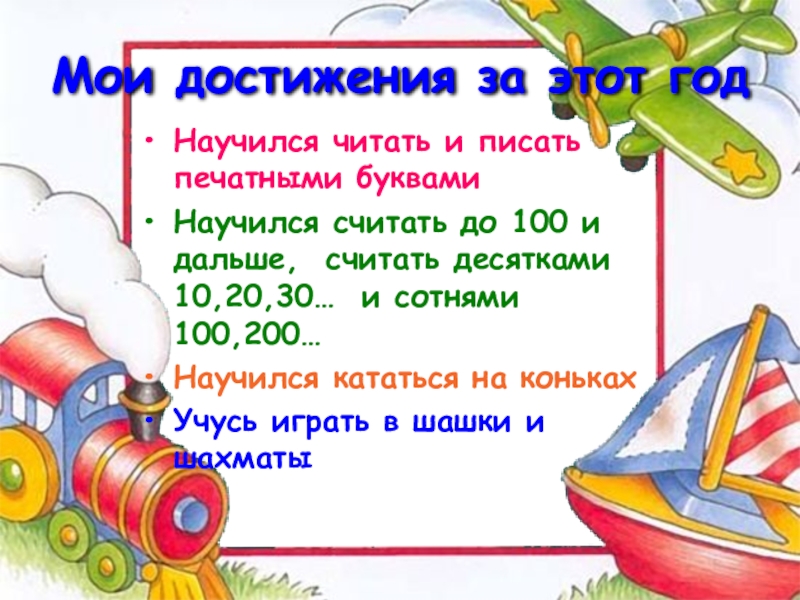 Мои достижения за этот годНаучился читать и писать печатными буквами Научился считать до 100 и дальше, считать