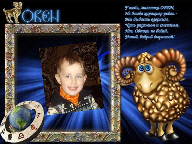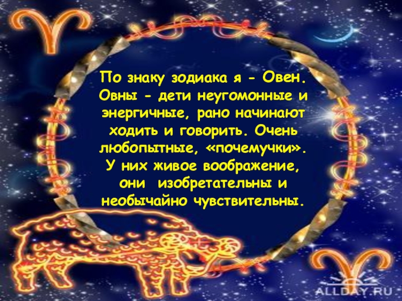 По знаку зодиака я - Овен. Овны - дети неугомонные и энергичные, рано начинают ходить и говорить.