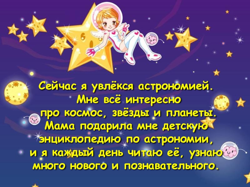 Сейчас я увлёкся астрономией. Мне всё интересно про космос, звёзды и планеты.Мама подарила мне детскую энциклопедию по