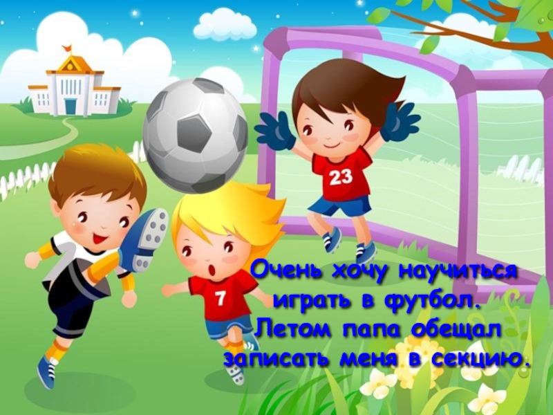 Очень хочу научитьсяиграть в футбол. Летом папа обещалзаписать меня в секцию.