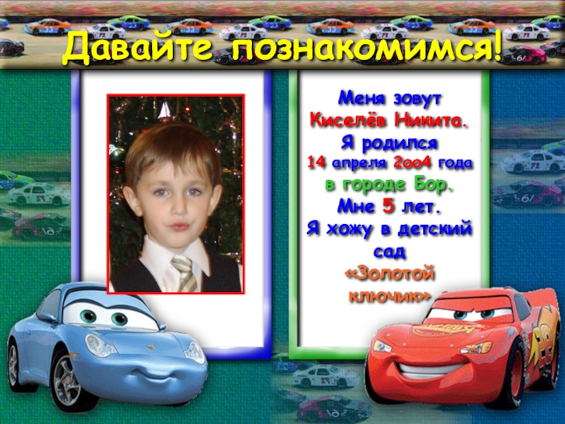 Давайте познакомимся!Меня зовут Киселёв Никита.Я родился 14 апреля 2оо4 года в городе Бор.Мне 5 лет.Я хожу в детский сад«Золотой ключик»