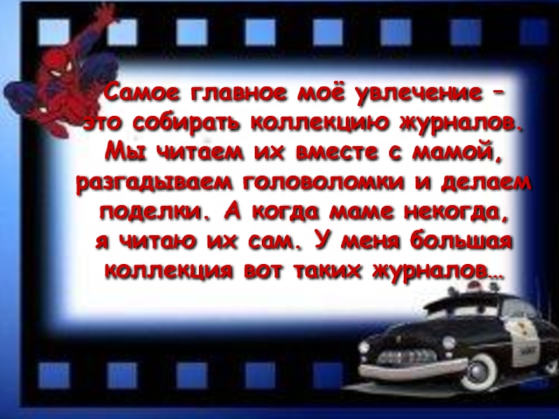 Самое главное моё увлечение – это собирать коллекцию журналов.Мы читаем их вместе с мамой,разгадываем головоломки и делаем
