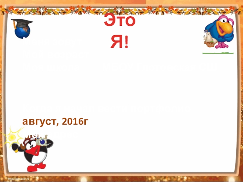 Это Я!Меня зовут Мой возраст Моя школа МБОУ Глотовская СШКогда я начал вести портфолио август, 2016гМой адрес