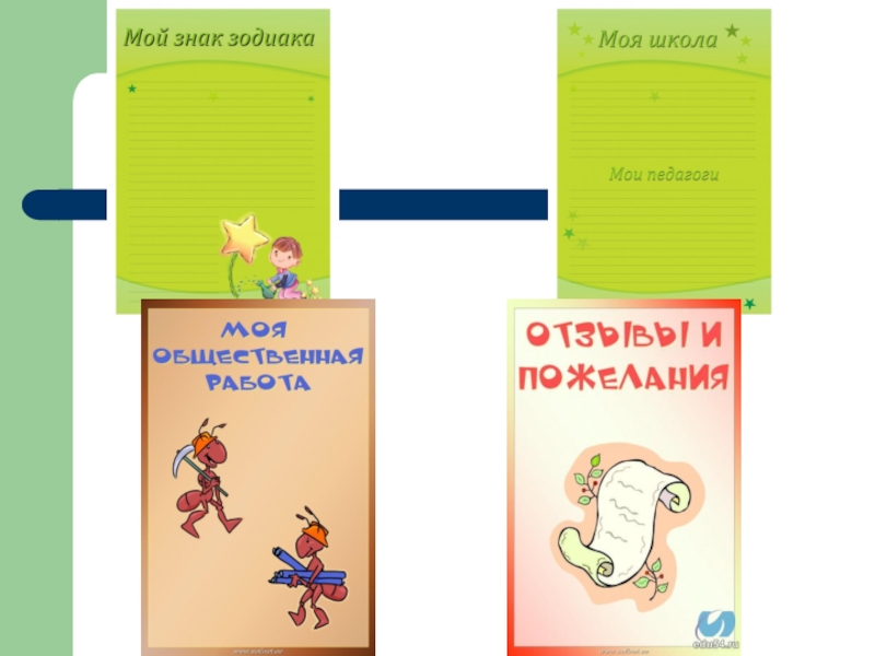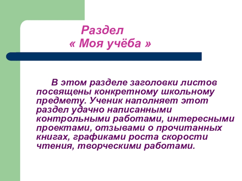 школьному предмету. Ученик наполняет этот раздел удачно написанными контрольными работами, интересными проектами, отзывами о прочитанных книгах, графиками роста скорости чтения, творческими работами.