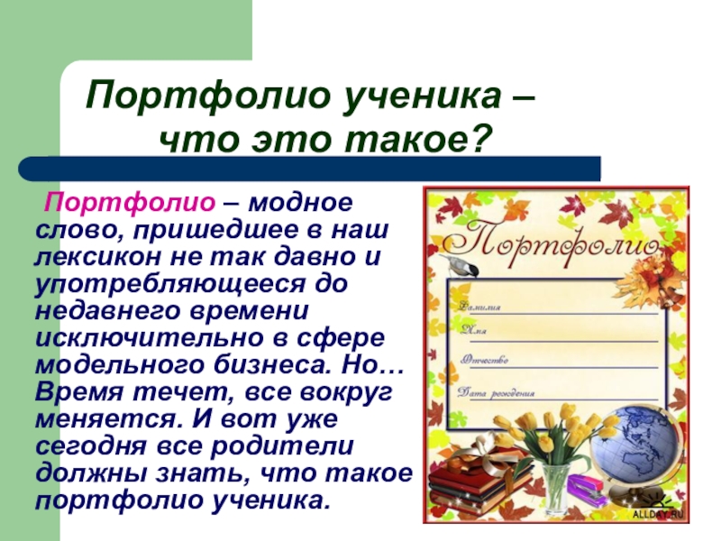 наш лексикон не так давно и употребляющееся до недавнего времени исключительно в сфере модельного бизнеса. Но… Время течет, все вокруг меняется. И вот уже сегодня все родители должны знать, что такое портфолио ученика.
