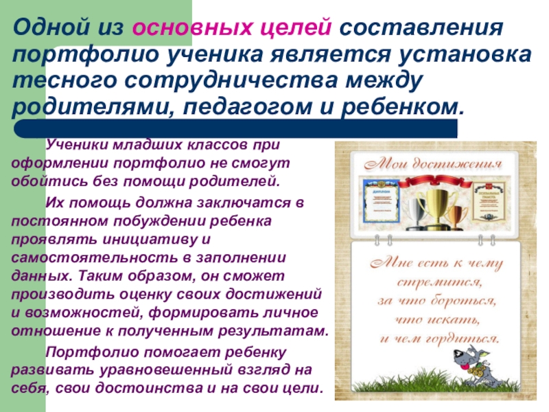 Слайд 4Одной из основных целей составления портфолио ученика является установка тесного сотрудничества