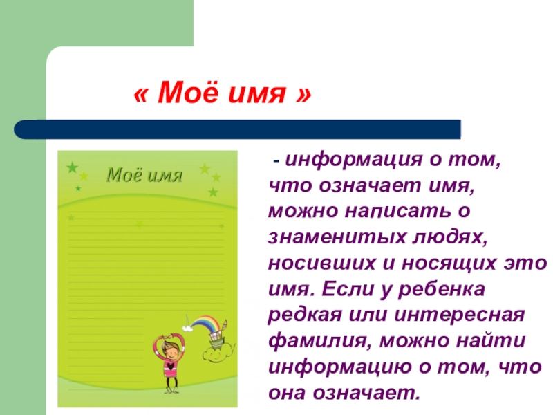 можно написать о знаменитых людях, носивших и носящих это имя. Если у ребенка редкая или интересная фамилия, можно найти информацию о том, что она означает.
