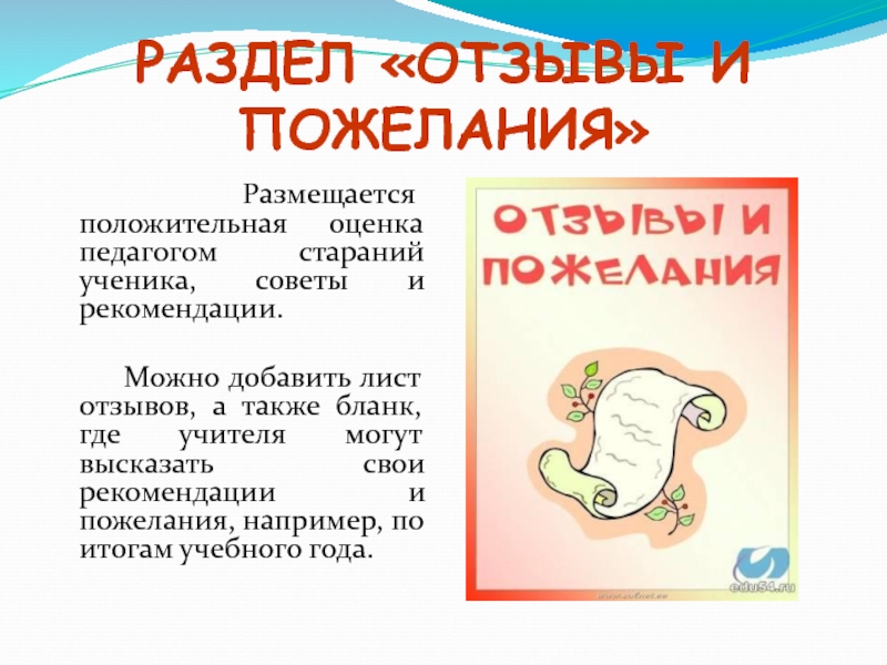 Можно добавить лист отзывов, а также бланк, где учителя могут высказать свои рекомендации и пожелания, например, по итогам учебного года.