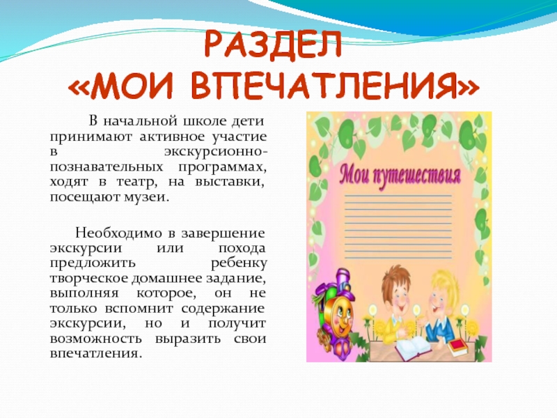 Необходимо в завершение экскурсии или похода предложить ребенку творческое домашнее задание, выполняя которое, он не только вспомнит содержание экскурсии, но и получит возможность выразить свои впечатления.