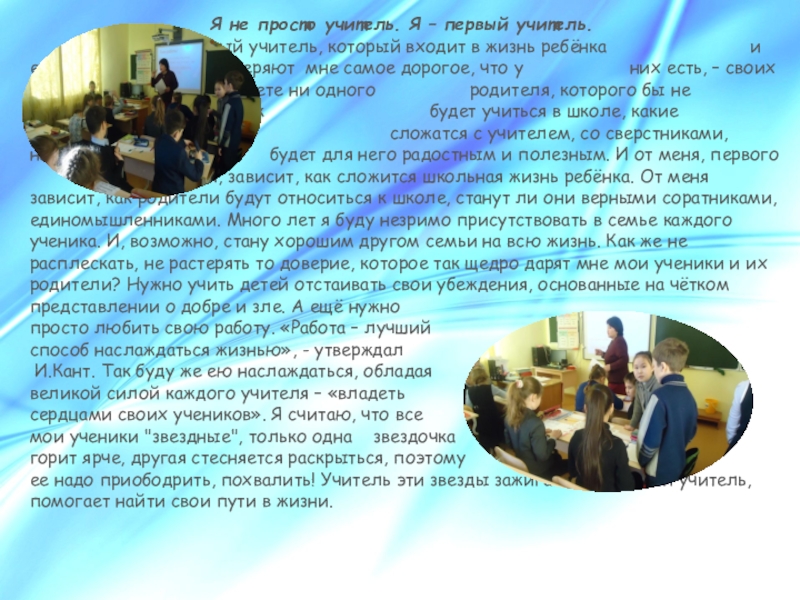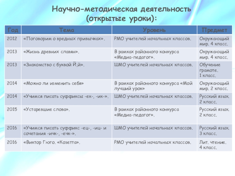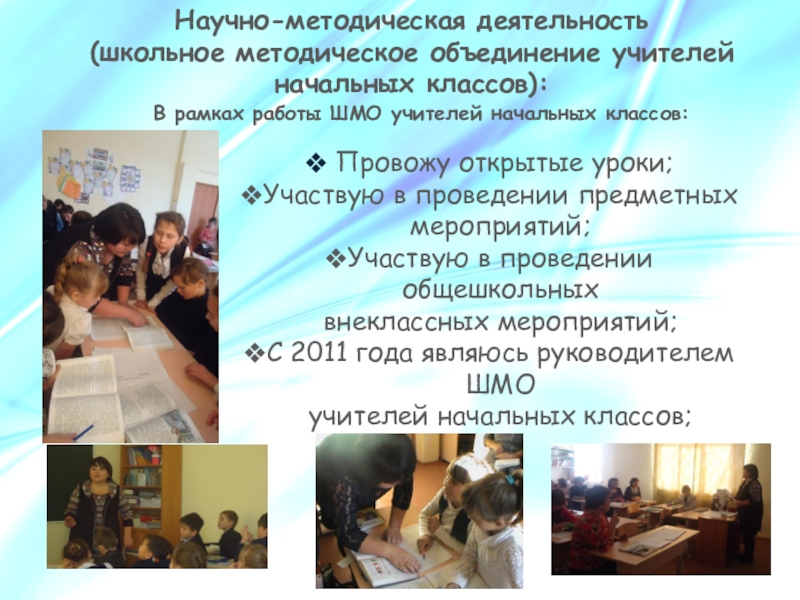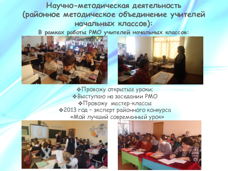 -участие в педсоветах, семинарах, в работе школьного и районного МО учителей начальных классов;