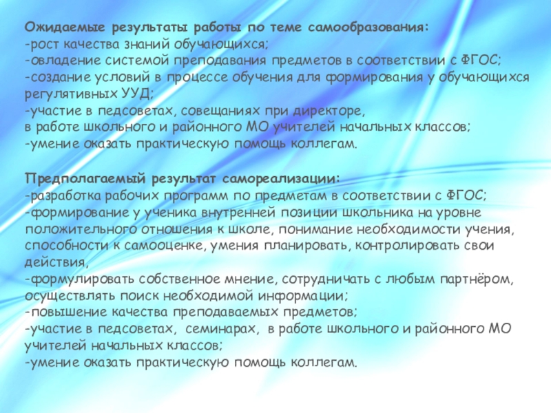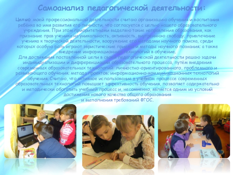 -формирование у ученика внутренней позиции школьника на уровне положительного отношения к школе, понимание необходимости учения, способности к самооценке, умения планировать, контролировать свои действия,