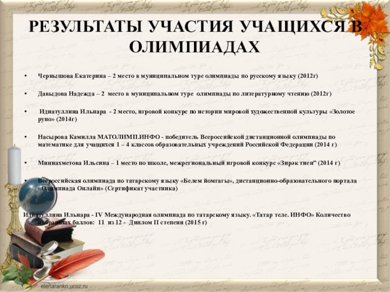 Идиатуллина Ильнара - IV Международная олимпиада по татарскому языку. «Татар теле. ИНФО» Количество набранных баллов: 11 из 12 - Диплом II степени (2015 г)
