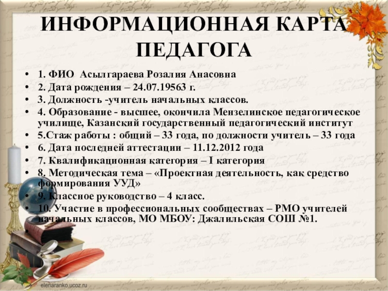 Слайд 5ИНФОРМАЦИОННАЯ КАРТА ПЕДАГОГА