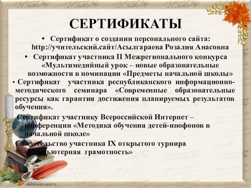 Сертификат о создании персонального сайта: http://учительский.сайт/Асылгараева Розалия Анасовна