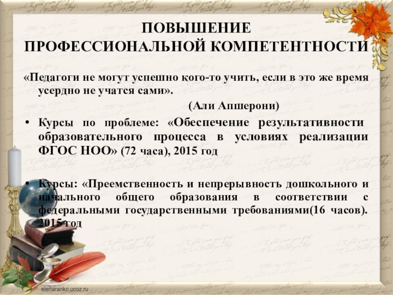 Курсы: «Преемственность и непрерывность дошкольного и начального общего образования в соответствии с федеральными государственными требованиями(16 часов). 2015 год