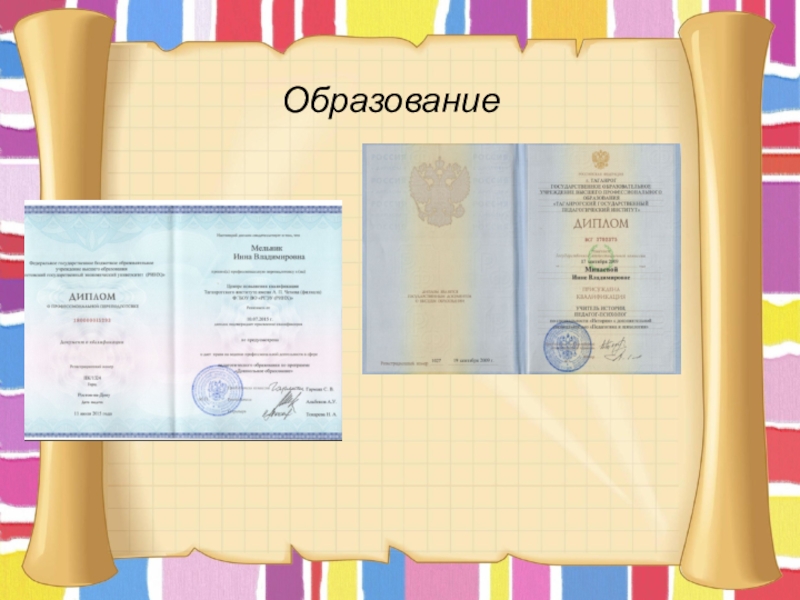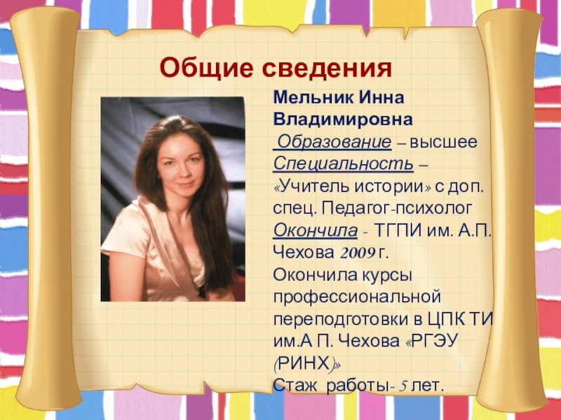Общие сведенияМельник Инна Владимировна Образование – высшееСпециальность – «Учитель истории» с доп. спец. Педагог-психолог Окончила - ТГПИ им. А.П. Чехова 2009 г.Окончила курсы профессиональной переподготовки в ЦПК ТИ им.А П. Чехова «РГЭУ(РИНХ)»Стаж работы- 5 лет.
