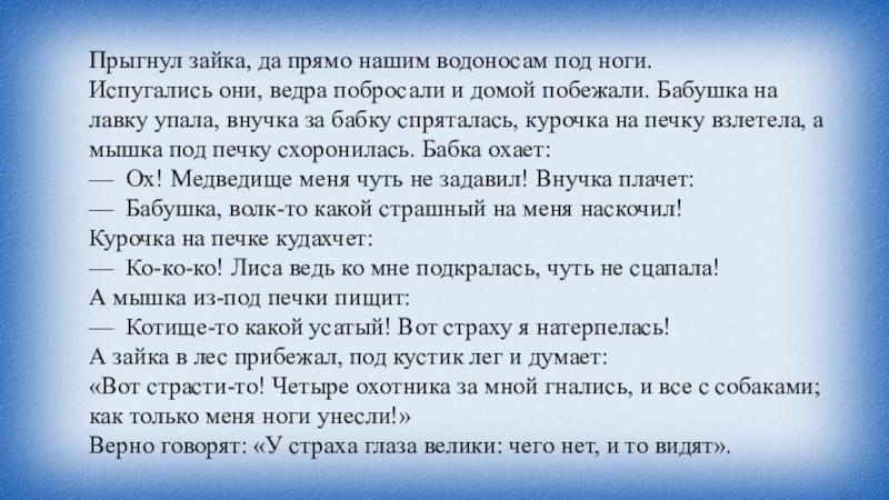 Слайд 12Прыгнул зайка, да прямо нашим водоносам под ноги.