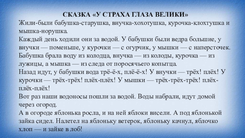 Слайд 11СКАЗКА «У СТРАХА ГЛАЗА ВЕЛИКИ»