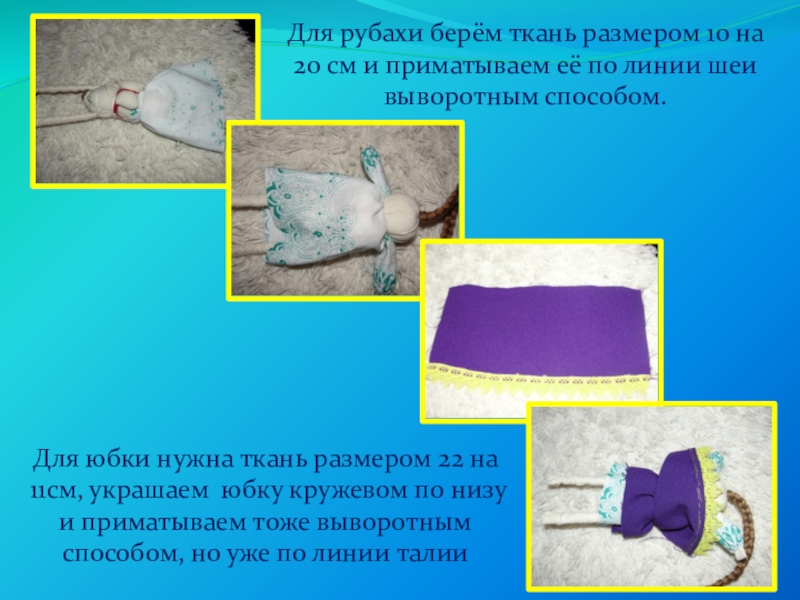Для юбки нужна ткань размером 22 на 11см, украшаем юбку кружевом по низу и приматываем тоже выворотным способом, но уже по линии талии