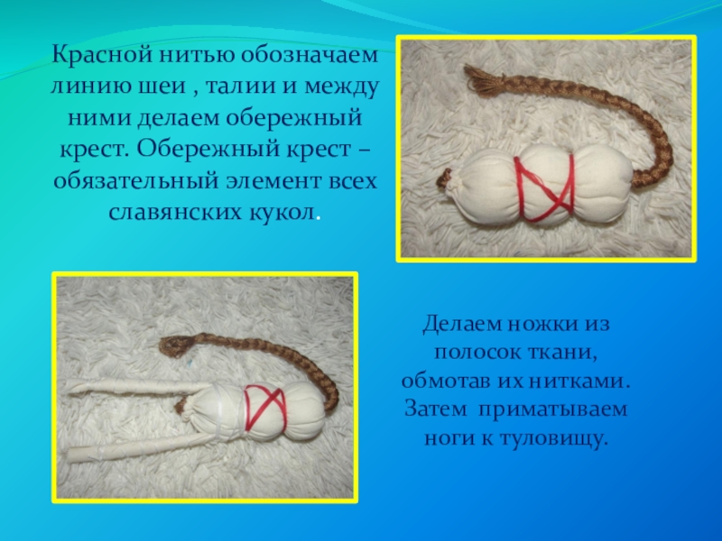 Делаем ножки из полосок ткани, обмотав их нитками. Затем приматываем ноги к туловищу.