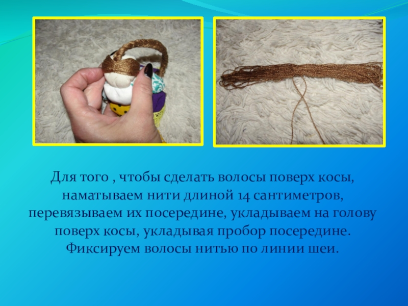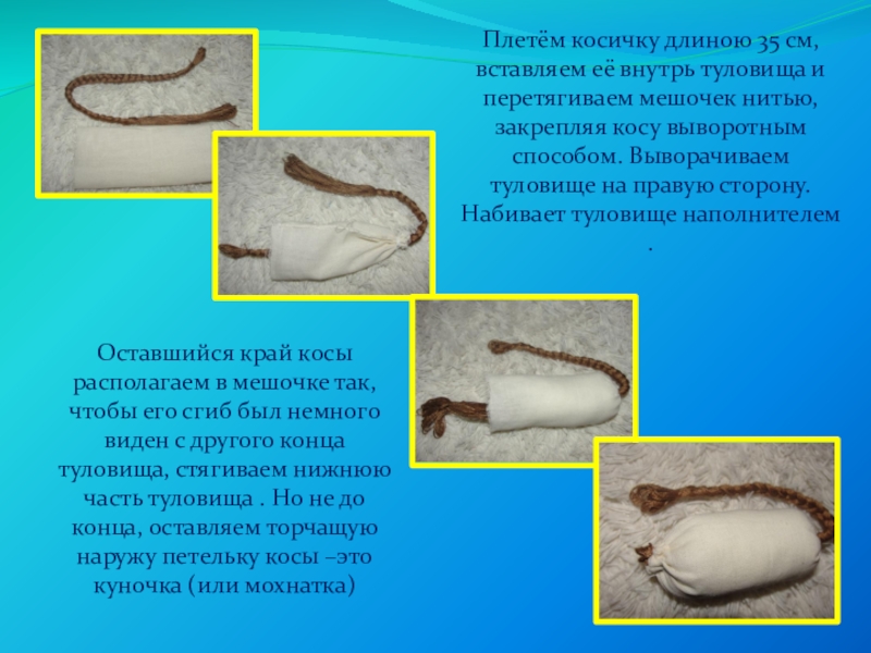 Оставшийся край косы располагаем в мешочке так, чтобы его сгиб был немного виден с другого конца туловища, стягиваем нижнюю часть туловища . Но не до конца, оставляем торчащую наружу петельку косы –это куночка (или мохнатка)