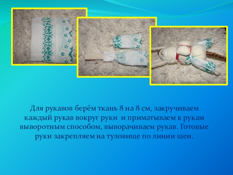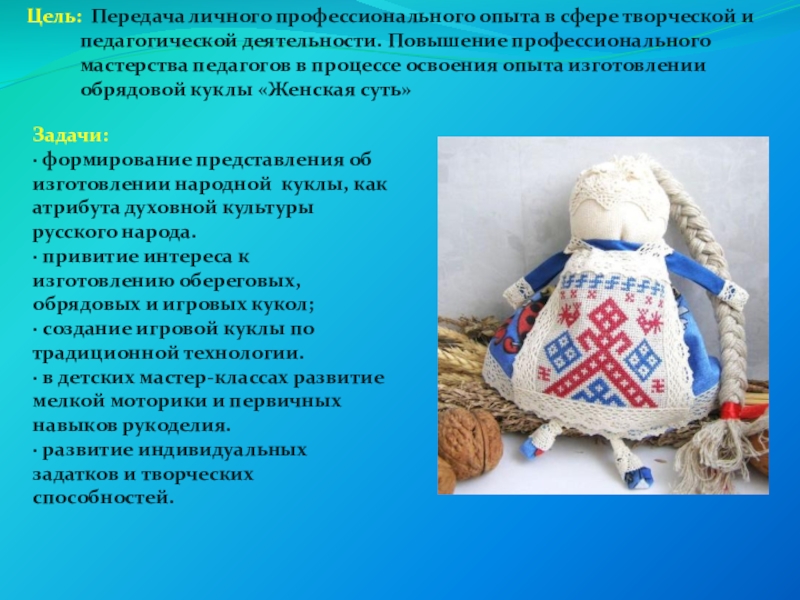 · формирование представления об изготовлении народной куклы, как атрибута духовной культуры русского народа.